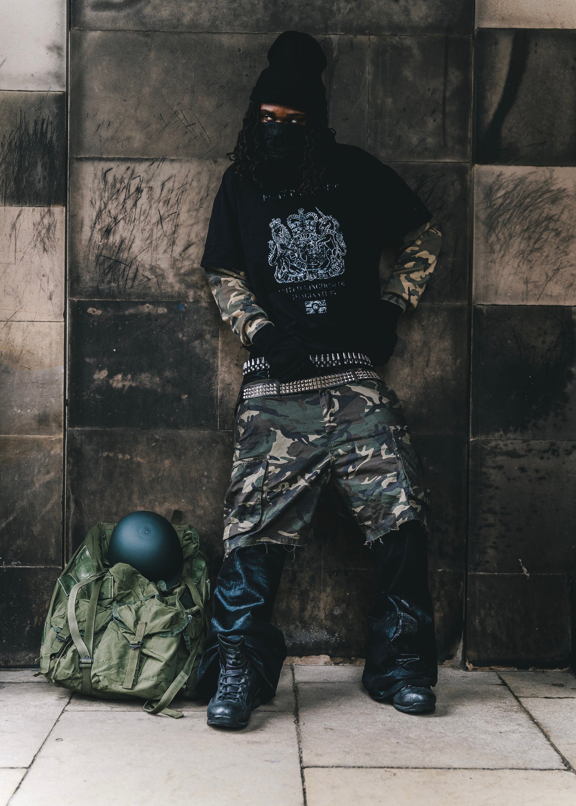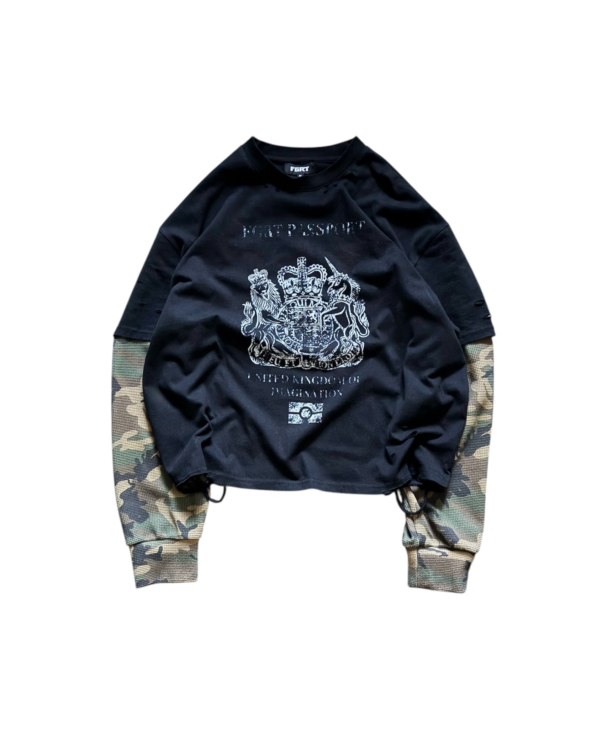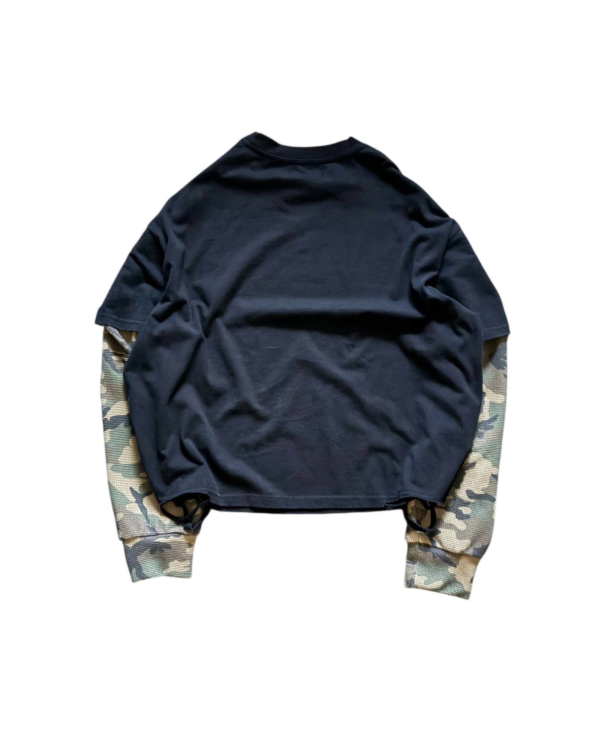 A black tee with printed crest graphic on the front. It features attached camouflage thermal sleeves for a layered look and has slight distressing on the body. The fit is cropped and slightly boxy.