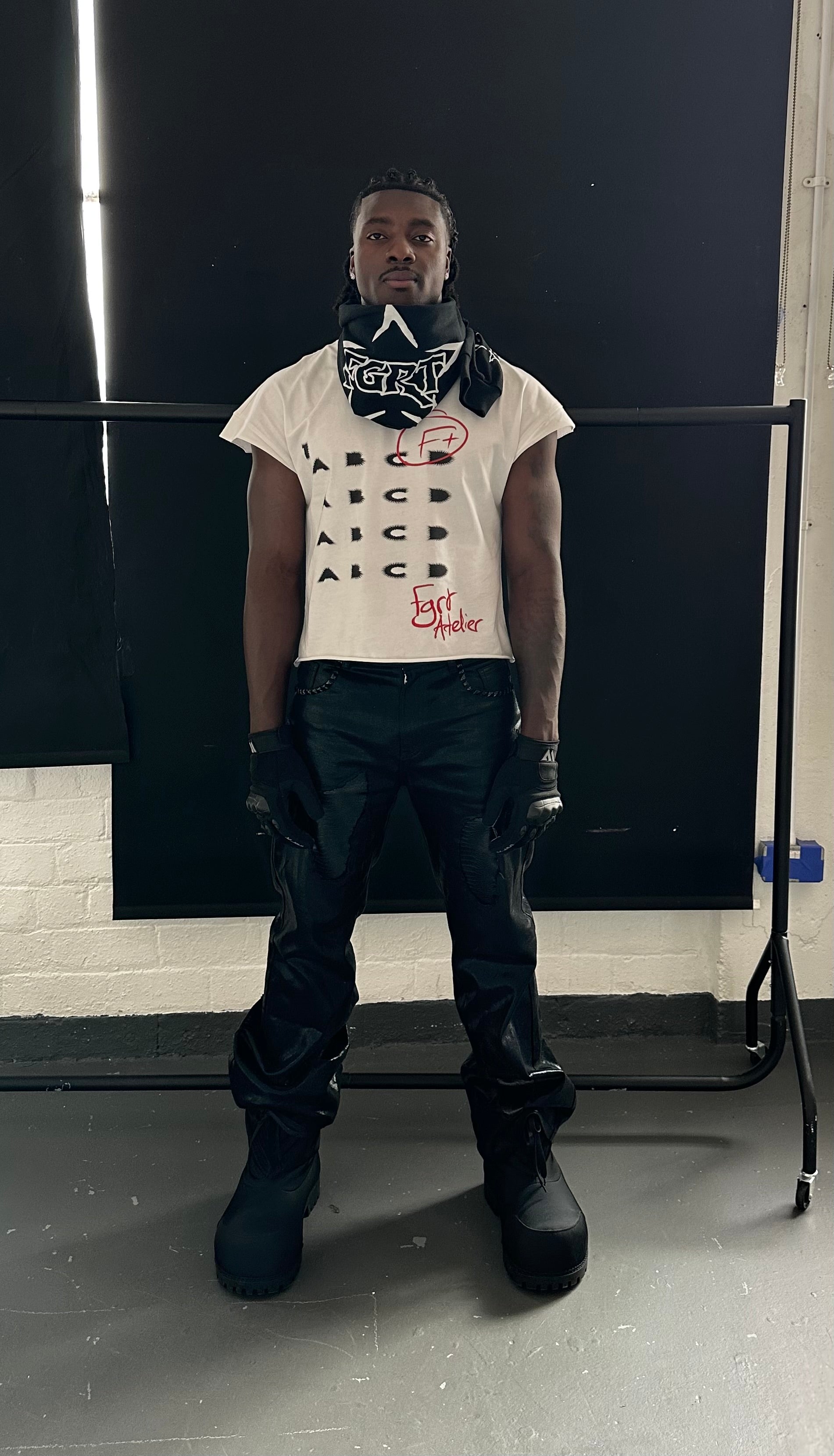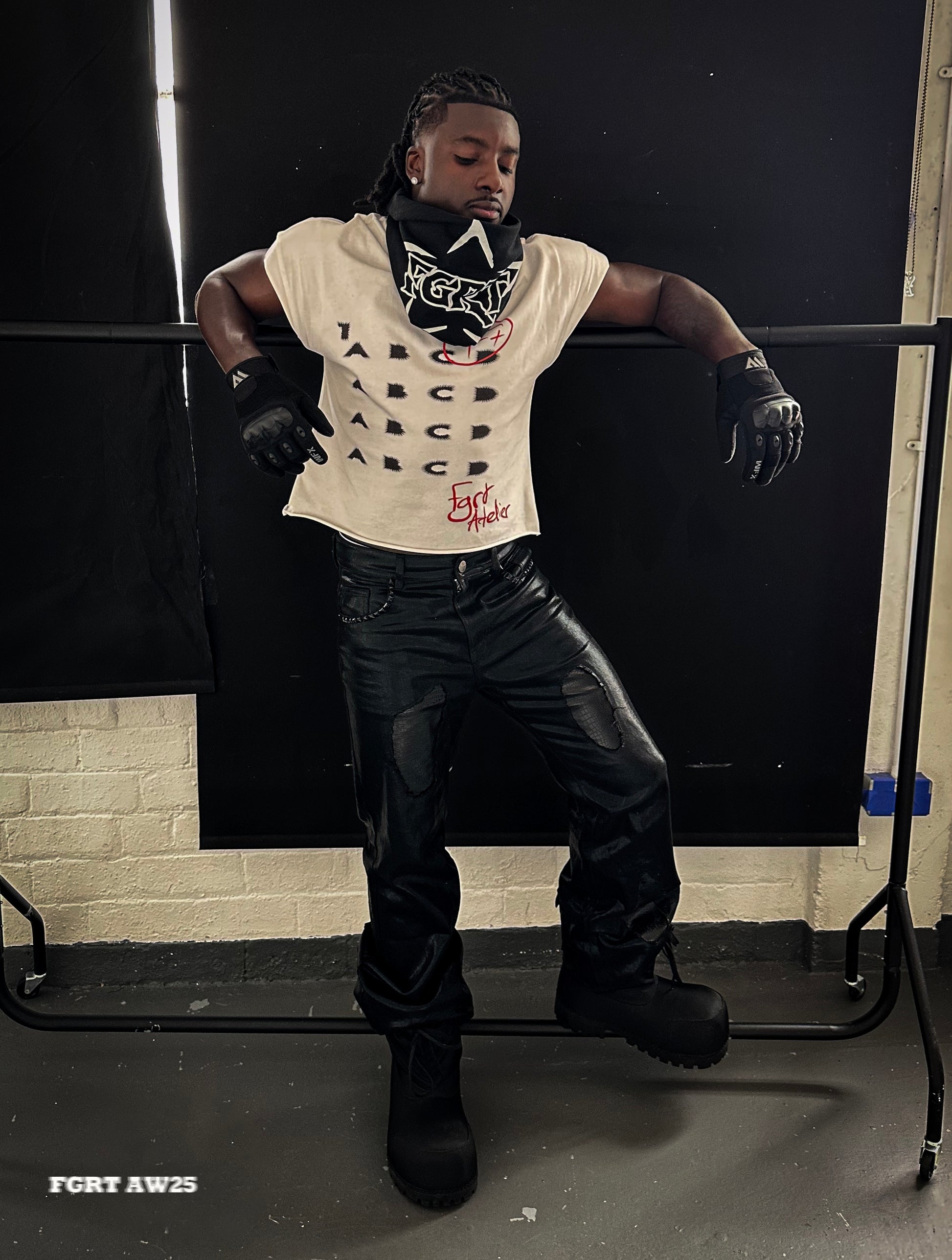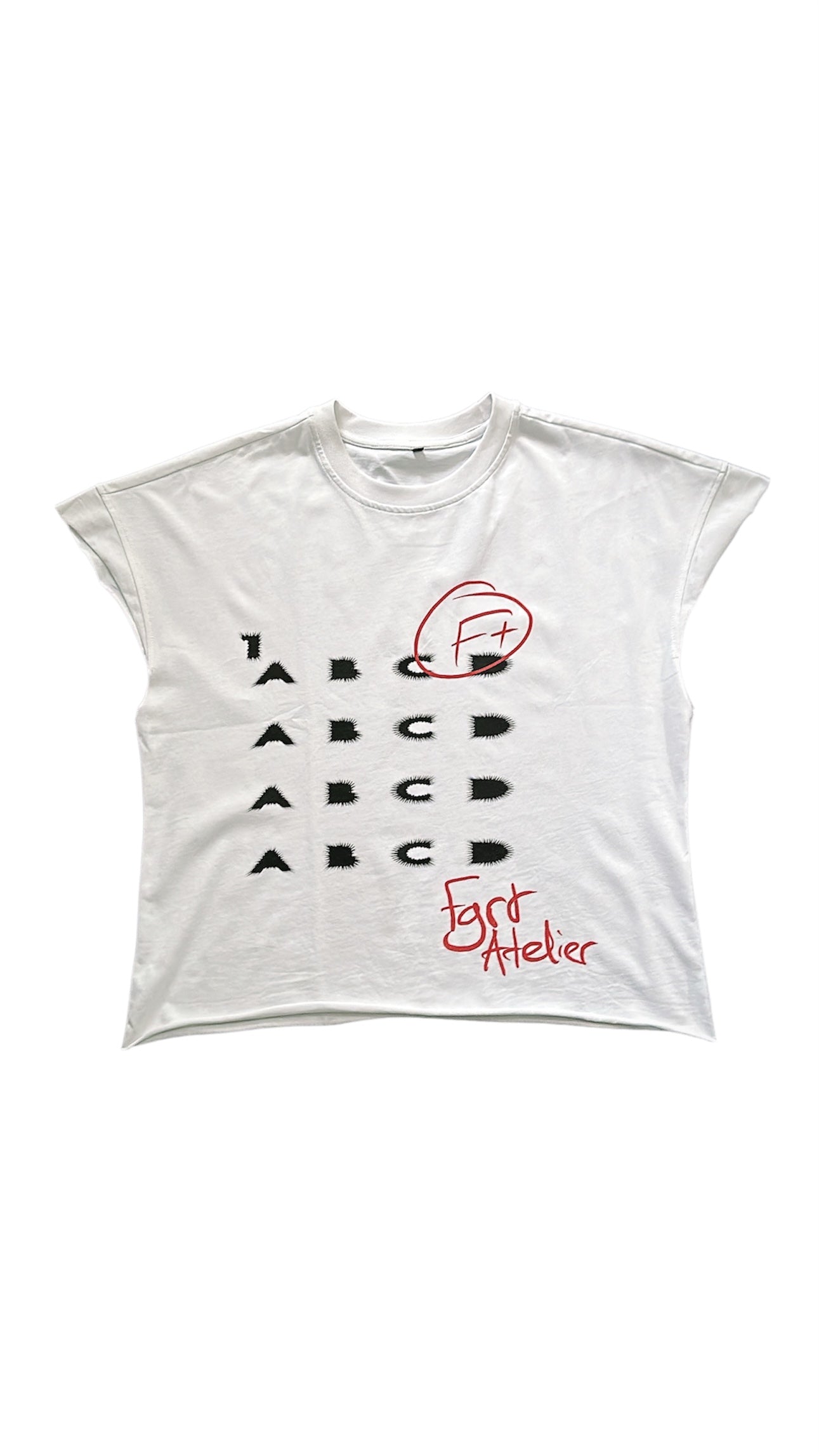 The stark black “ABCD” typography across the chest contrasts the clean white base, while the graded “F+” graphic flips the idea of perfection on its head, a badge of rebellion against conformity.