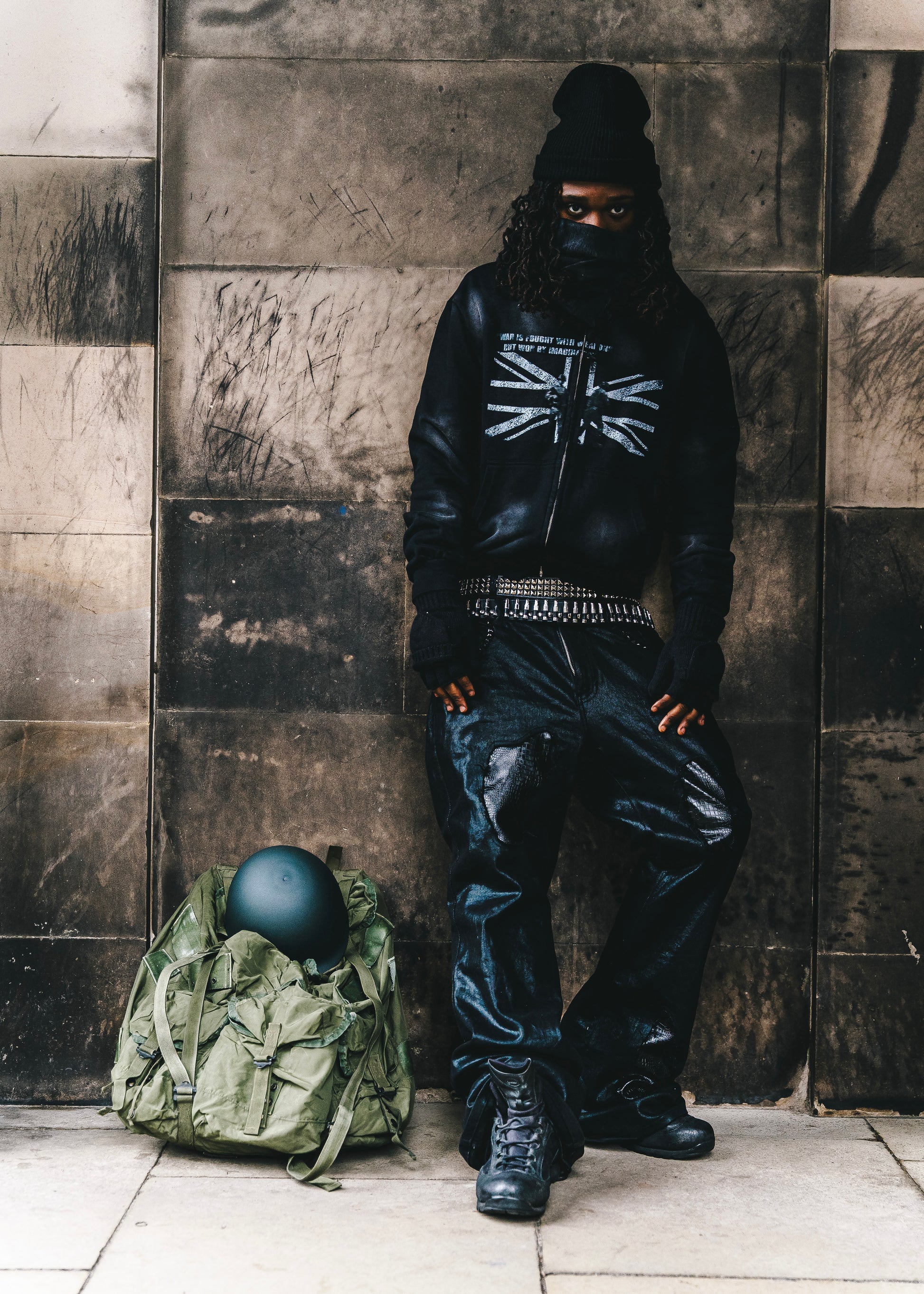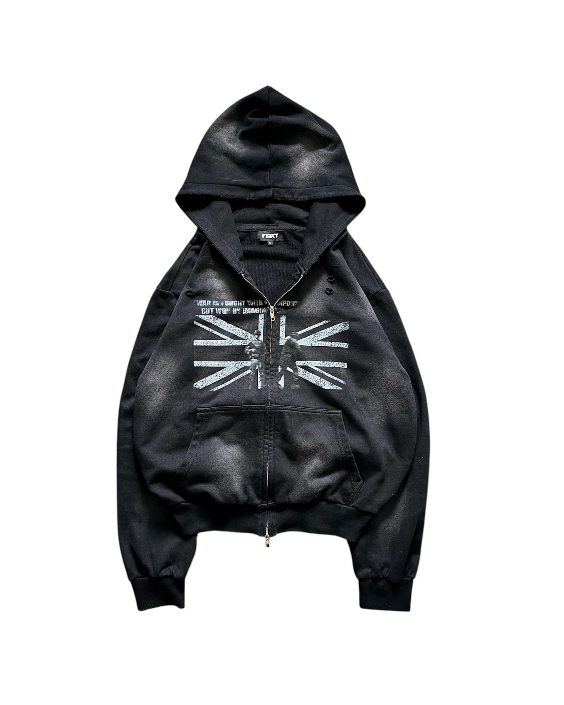 A black zip-up hoodie featuring a faded graphic on the front inspired by the UK flag design. It includes light distressing, a full front zipper, a kangaroo pocket, and an oversized hood. The fabric has a washed, worn-in look.